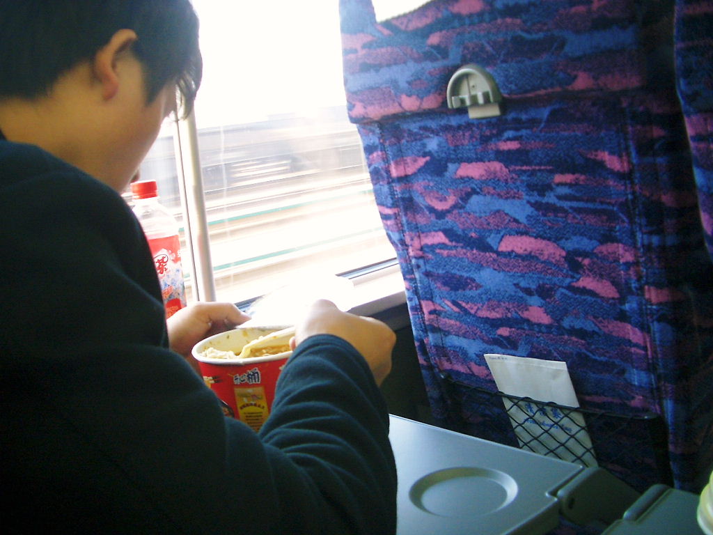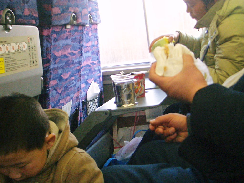 出発と同時に食べ物を食べ出す人がほとんどだ、カップラーメンやマイカップで水を飲む人、点心などを食べる人様々である
